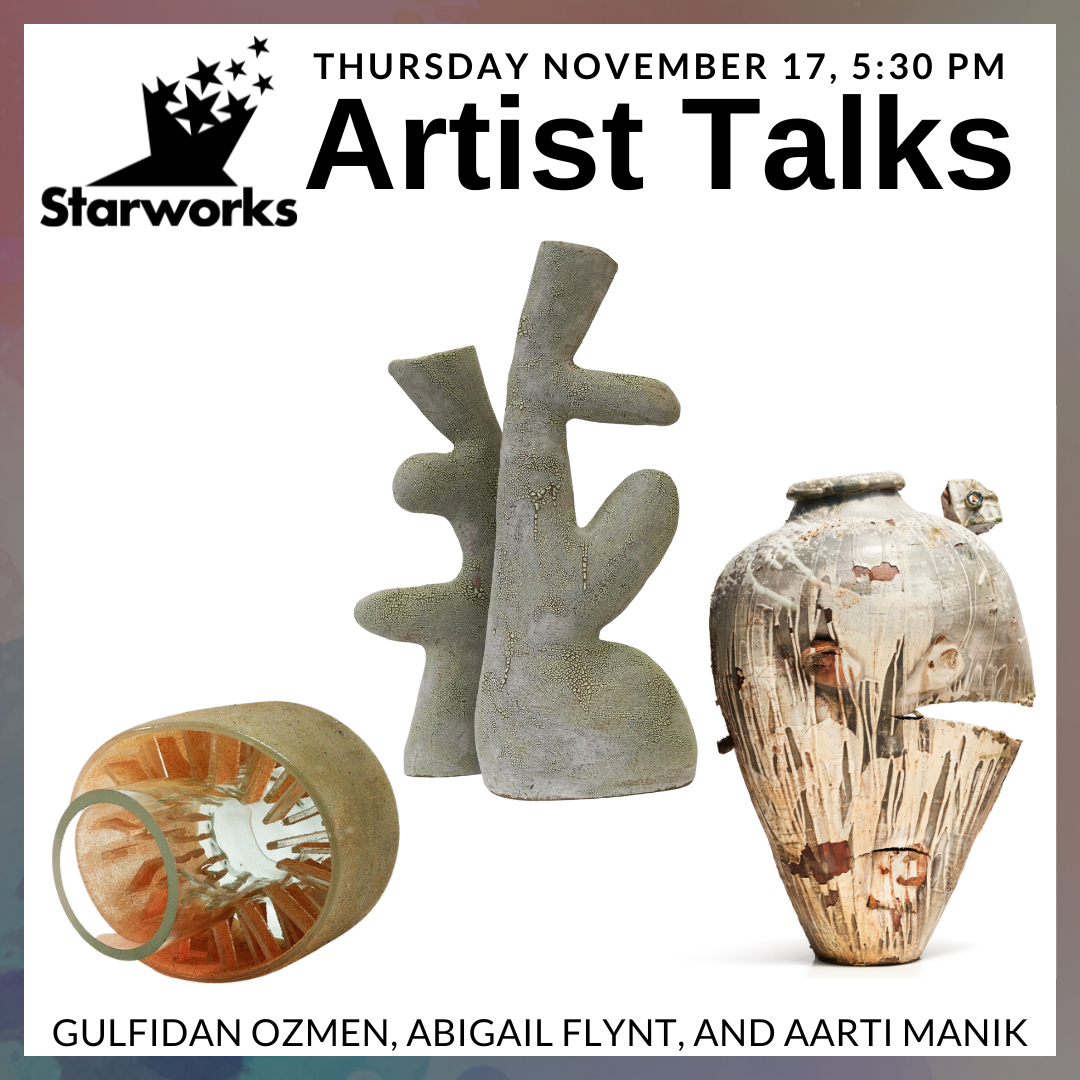Join us at Starworks on November 17, 5:30pm for Artist Talks from glass artist Gulfidan Ozmen, and ceramicists Abigail Flynt and Aarti Manik. Each artist will present slides and discuss some of their processes and influences involved in making their work. Stick around after the talks to meet the artists and ask questions.