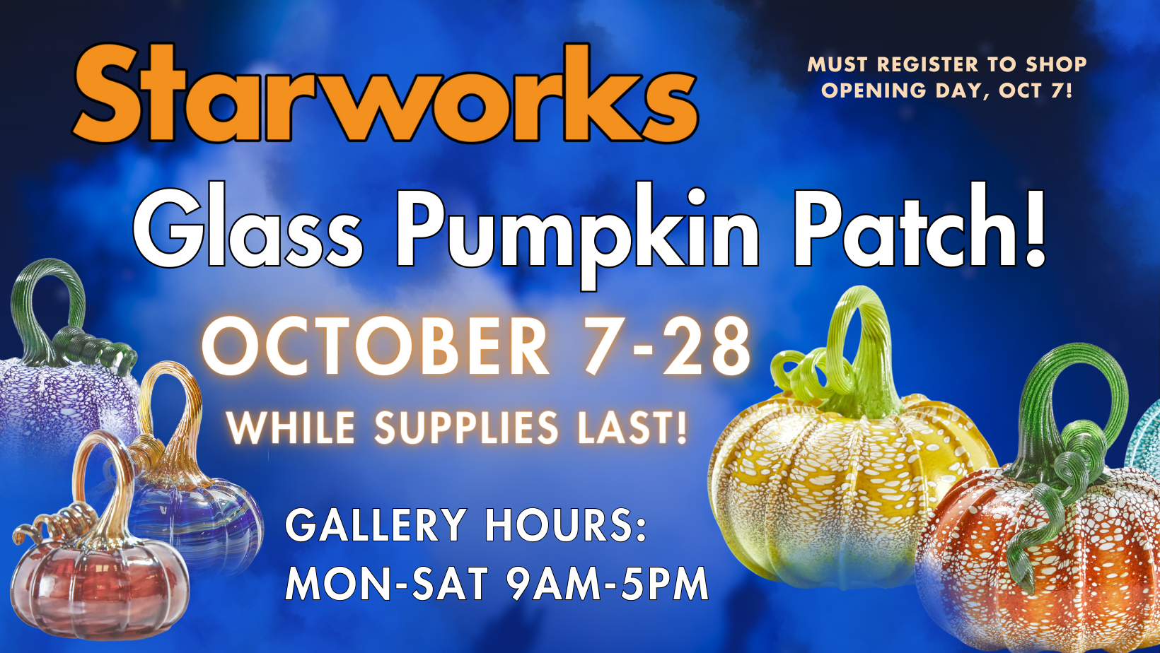 Choose from more than 3,000 hand-blown pumpkins in a wide variety sizes, shapes and colors. Each pumpkin is handmade by Starworks Glass artists and interns. Most pumpkins are priced between $55 and $110, although there are always some very special ones that will cost more.