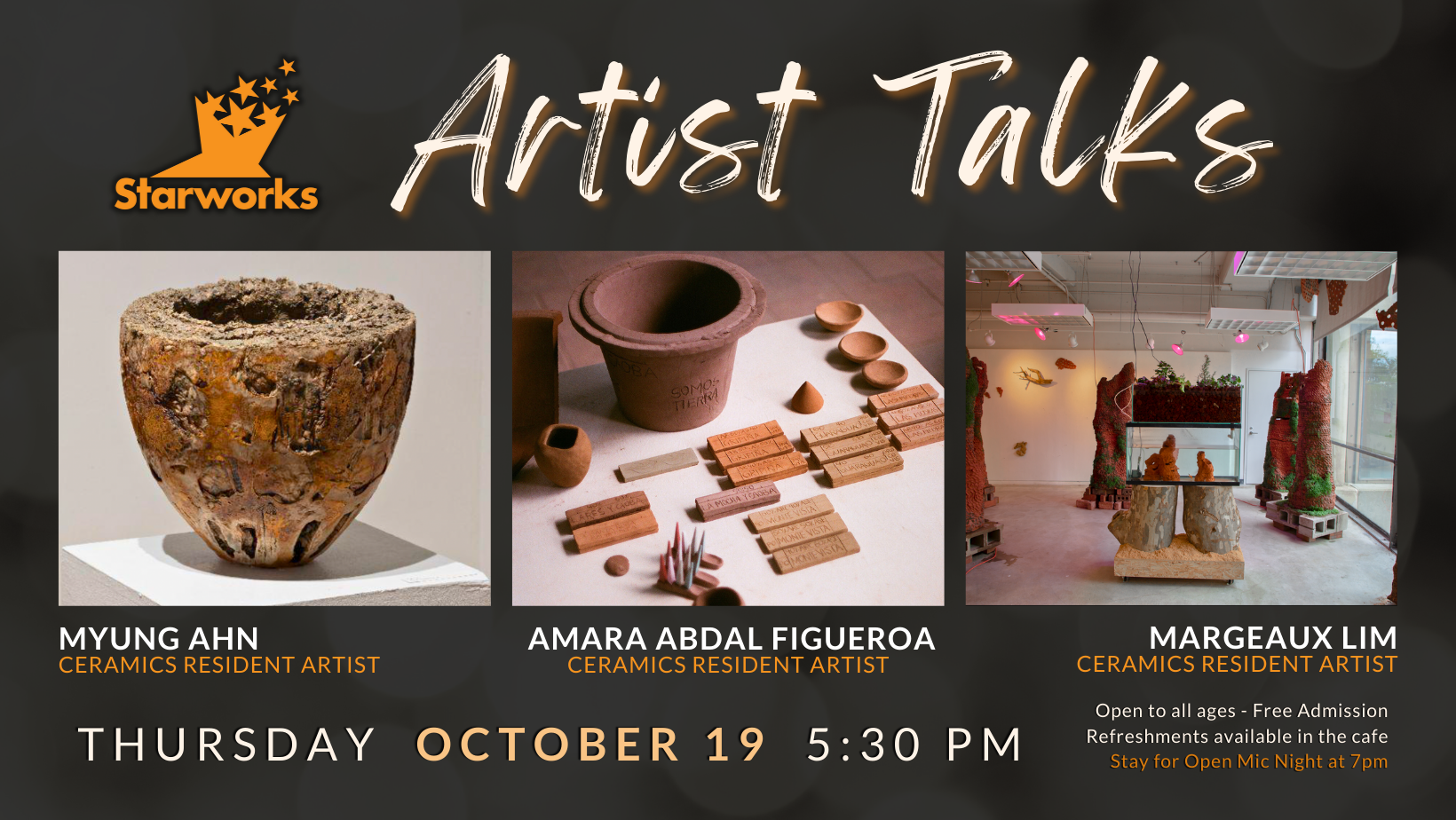 Join us at Starworks on Thursday, October 19th, 5:30pm for Artist Talks from Starworks Ceramics Residents Myung Ahn, Amara Abdal Figueroa, and Margeaux Lim. Each artist will present slides and discuss some of their processes and influences involved in making their work. Stick around after the talks to meet the artists and ask questions.