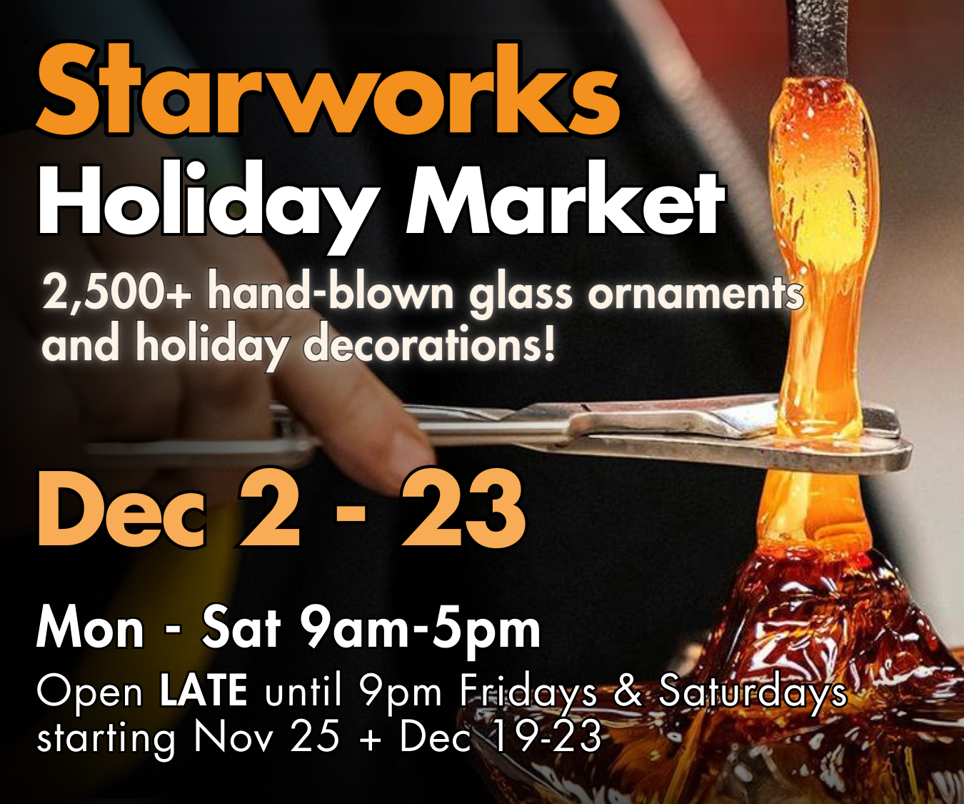 Starworks Artists in Glass, Metal, and Ceramics will also have the opportunity to present their own unique holiday works during the sale. Look for the “Signature Series” while you’re here. You won’t want to miss this chance to scoop up some originals and exciting one-offs!