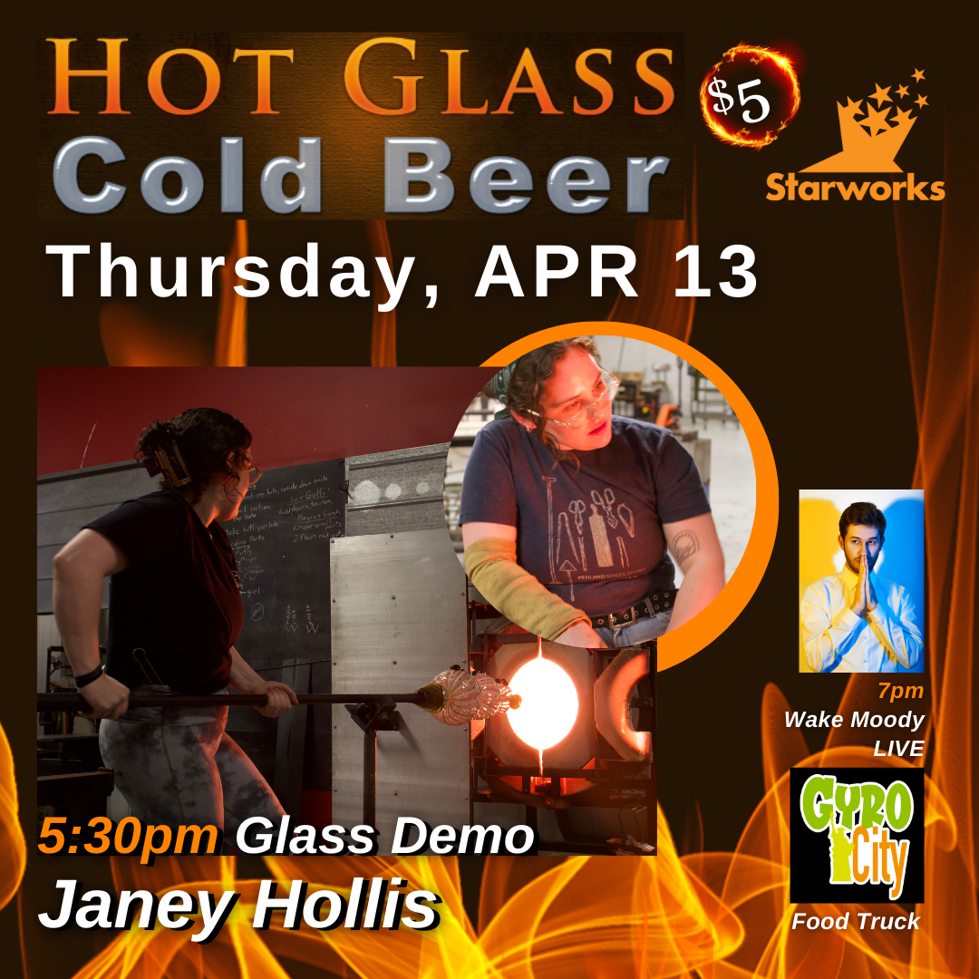 Join us as a featured glass artist, Janey Hollis, performs an exciting glassblowing demonstration with assistance from the Starworks Glass team. Live music in the cafe following the demonstration, from Wake Moody. Gyro City food truck will be on site.
