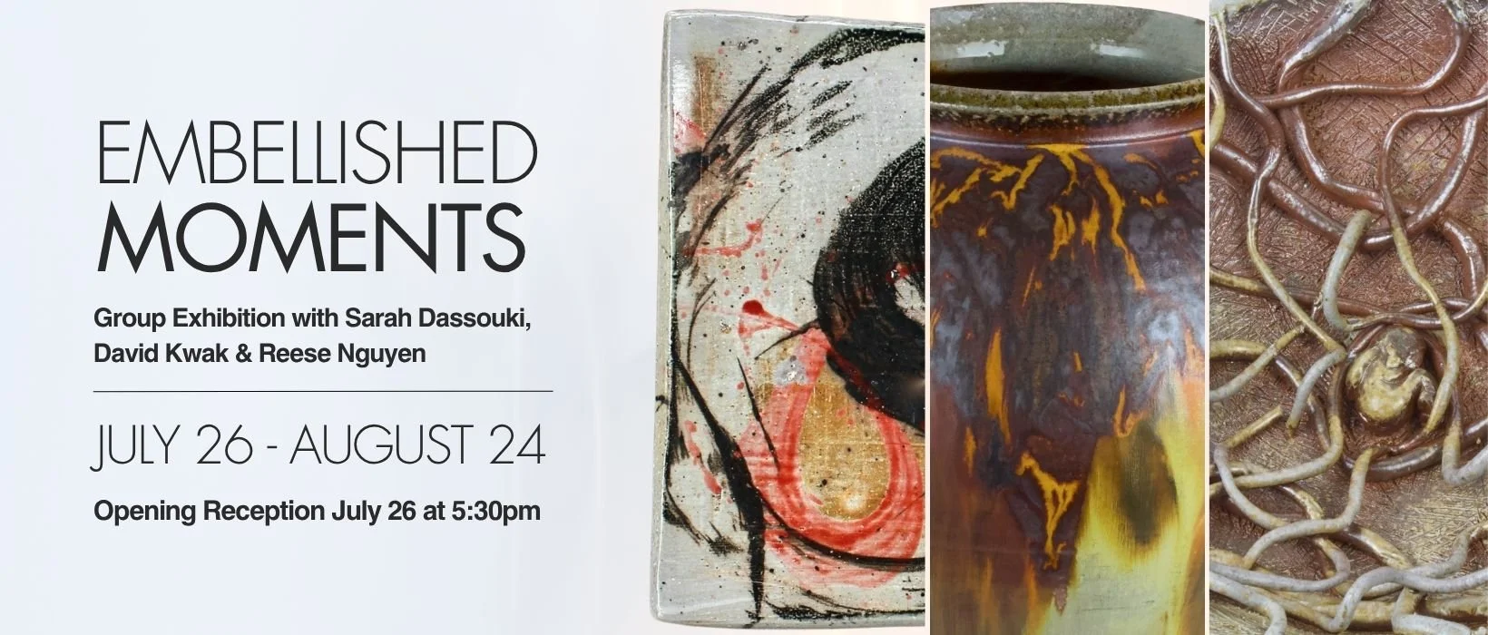 Embellished Moments features new work by our 2024–2025 ceramic interns — Sarah Dassouki, David Kwak, and Reese Nguyen — as they conclude their time at Starworks. Over the past year, these emerging artists have explored wild clays, honed new techniques, supported visiting residents, and played an essential role in our studio community. Their work reflects the depth of that experience and the energy of what’s next.