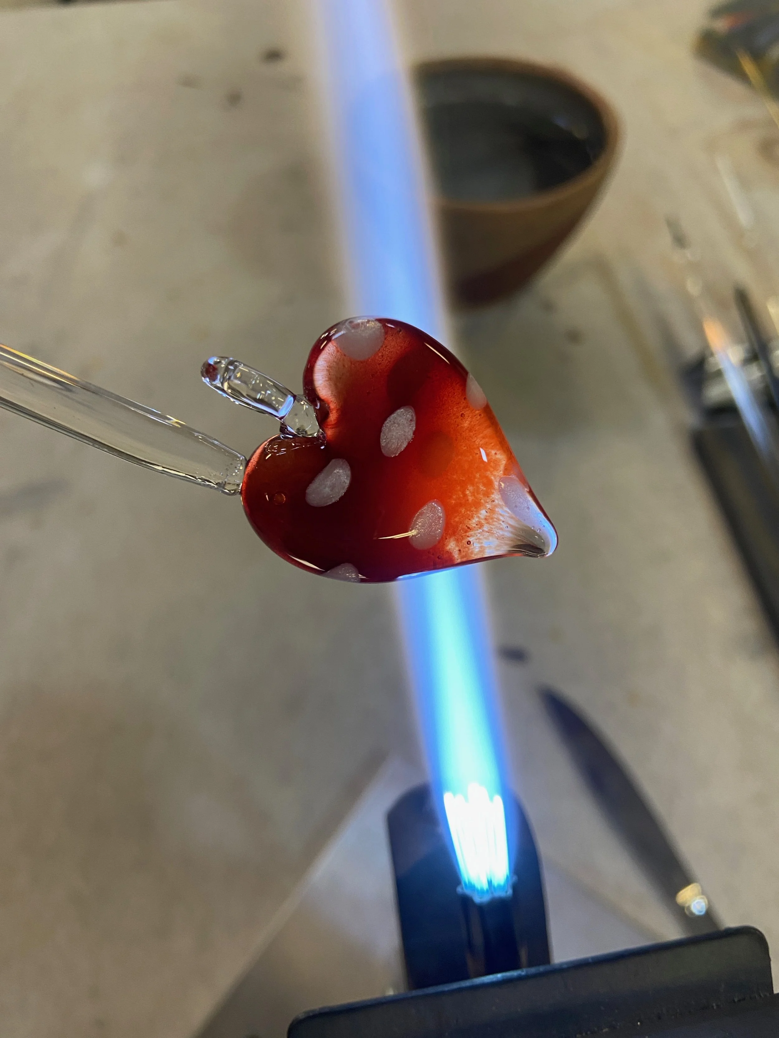 Experience the magic of working with molten glass in this hands-on flameworking workshop. During this 90 minute class, you’ll use a small oxygen/propane torch to heat and shape glass rods, learning the basics of flameworking as you create your own glass heart pendant from start to finish.