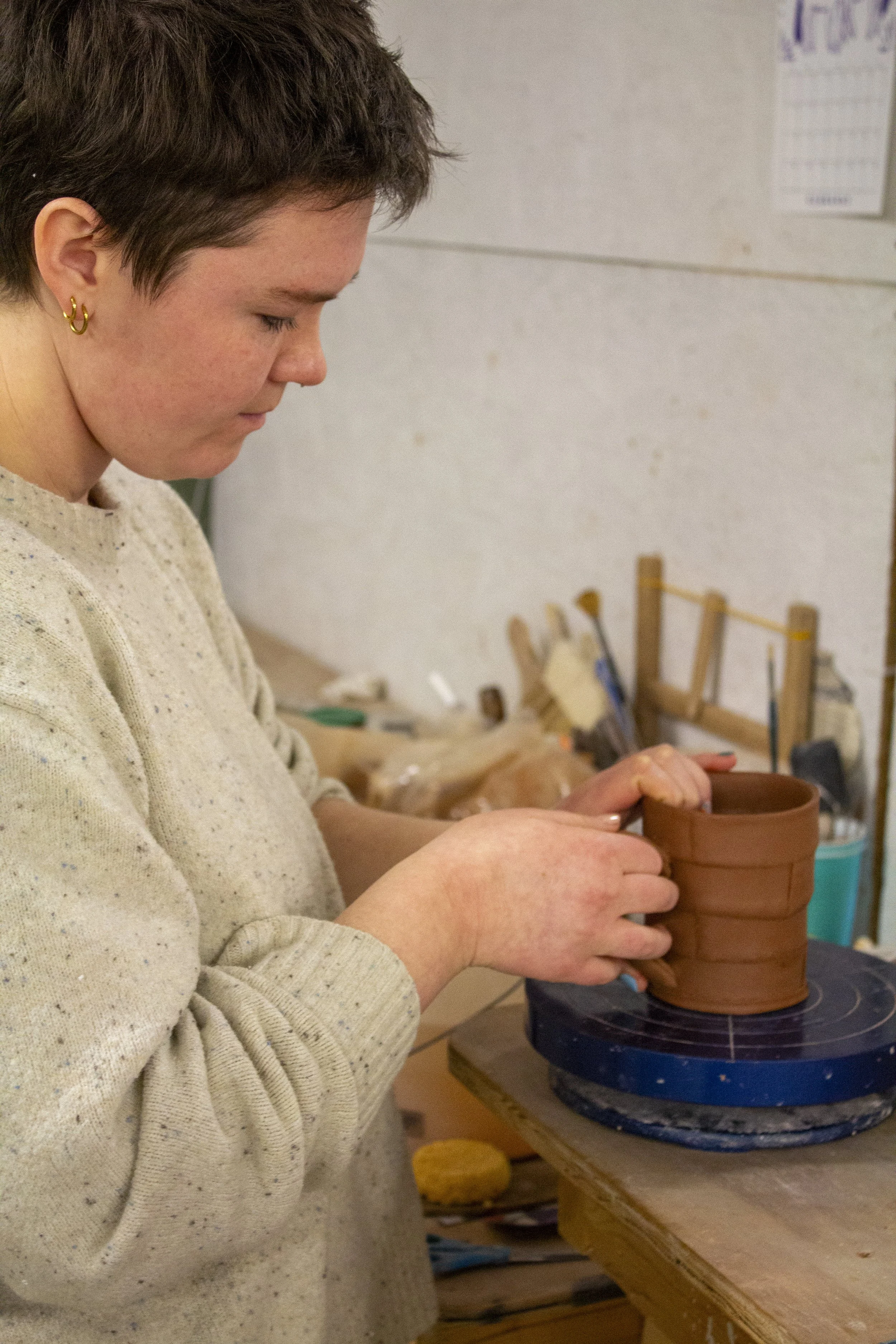Aislinn Baker is the current clay making intern at starworks in Star, NC. She received her BFA at Utah State University under the guidance of John Neily, Daniel Murphy, and Todd Hayes. Aislinn was awarded the Caine Scholars Scholarship Award as well as the outstanding Senior Award from USU in 2025. She has presented her work at NCECA’s Juried National Teapot Show in 2025 as well as the Tippets and Eccles Galleries at USU. Her work is inspired by Familial relationships, Fiber arts, and Floral Motifs.