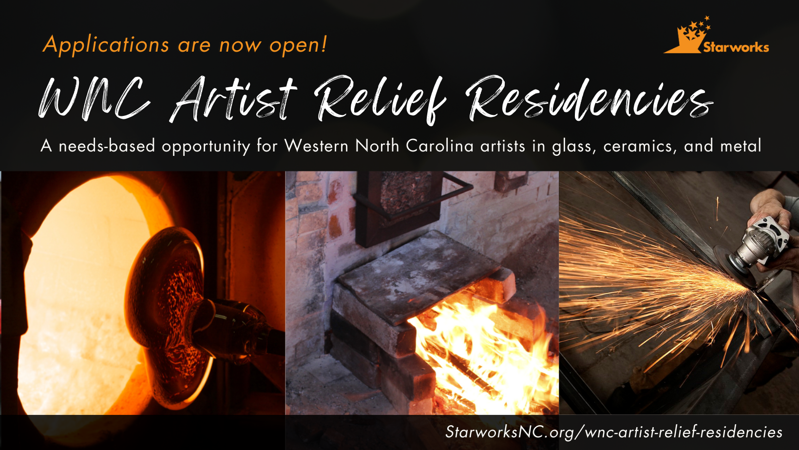 Starworks is offering needs-based short-term residencies in 2025 to provide affected artists in Western NC with space, assistance, and resources to meet upcoming deadlines. To apply, complete the form below. Email any questions to Contact@StarworksNC.org.